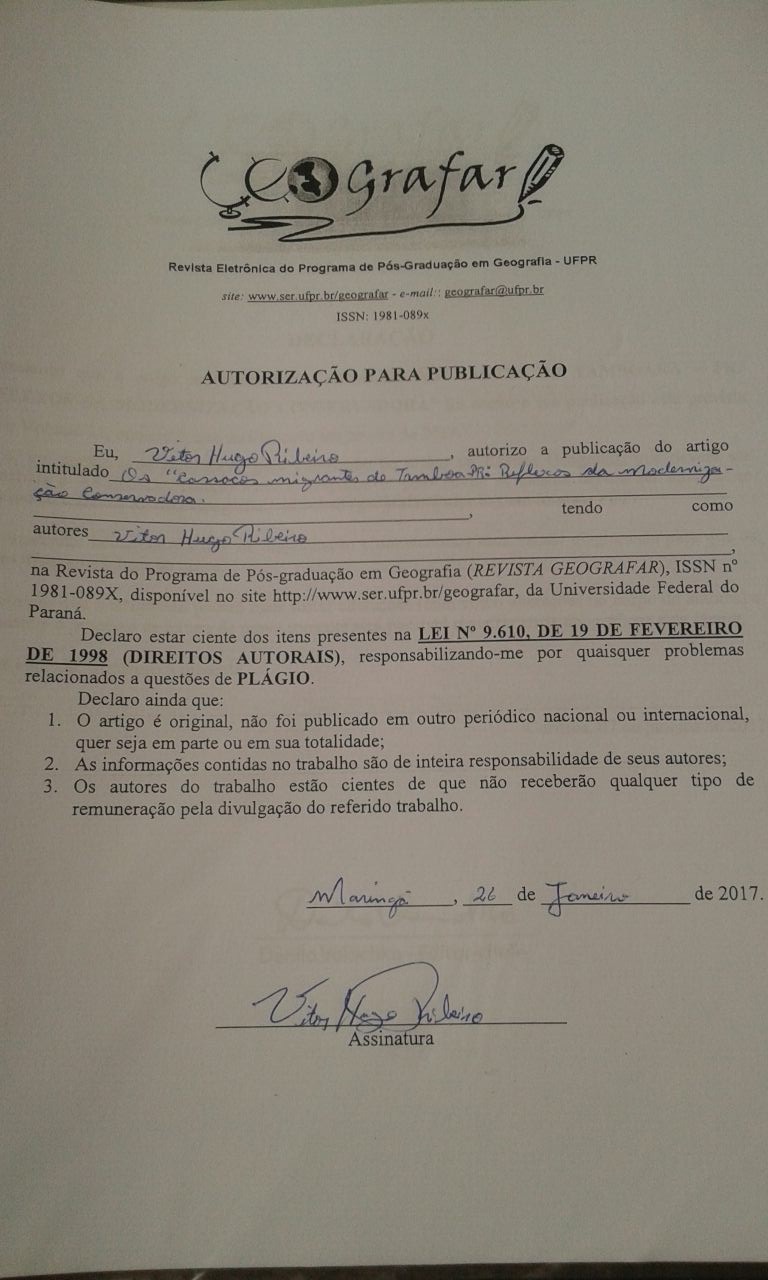 – os autores têm autorização para assumir contratos adicionais separadamente, para distribuição não exclusiva da versão do trabalho publicada na Revista Geografar (ex.: publicar em repositório institucional ou como capítulo de livro), com reconhecimento da autoria e da publicação inicial na Revista;