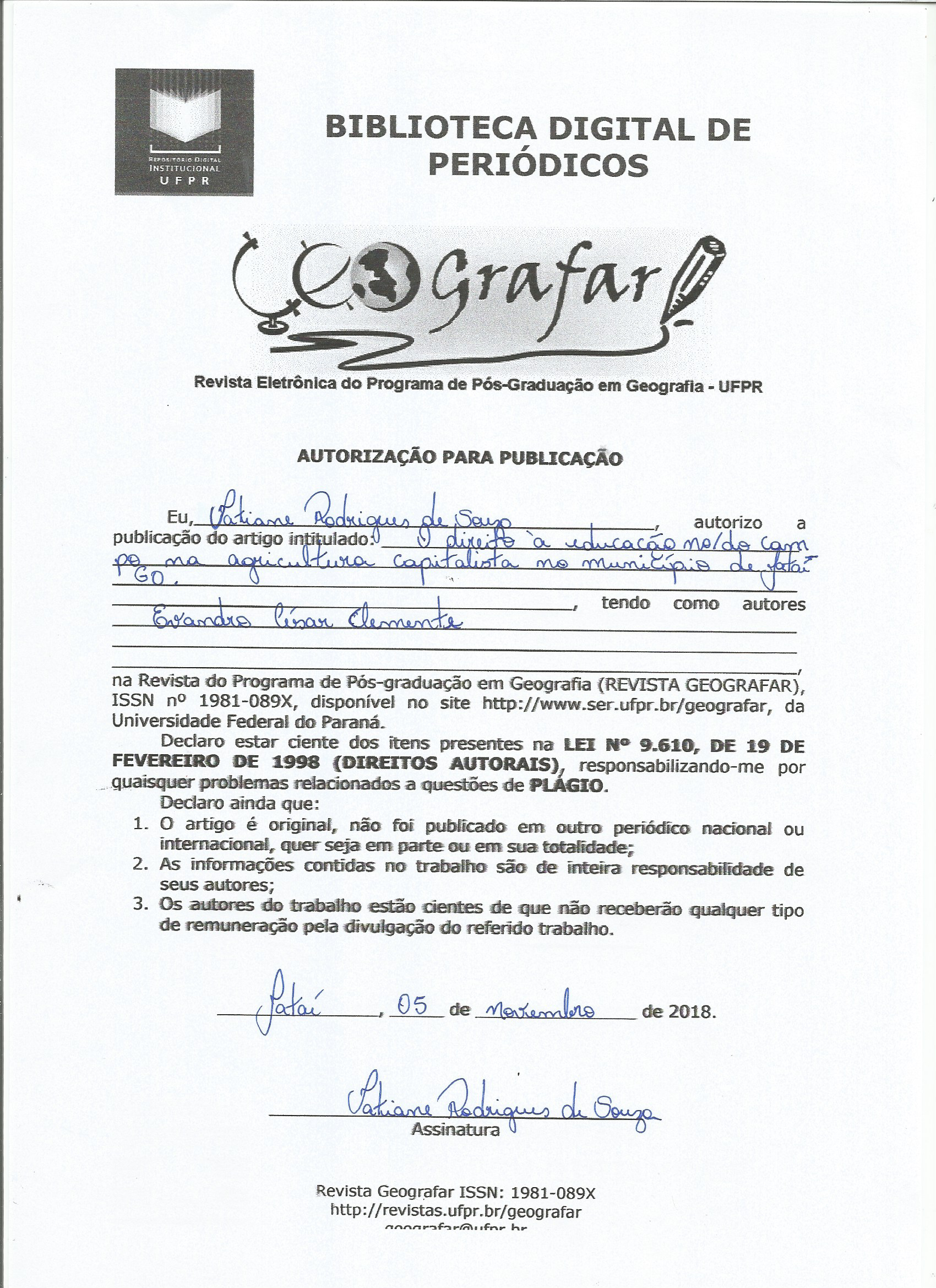 – os autores têm autorização para assumir contratos adicionais separadamente, para distribuição não exclusiva da versão do trabalho publicada na Revista Geografar (ex.: publicar em repositório institucional ou como capítulo de livro), com reconhecimento da autoria e da publicação inicial na Revista;