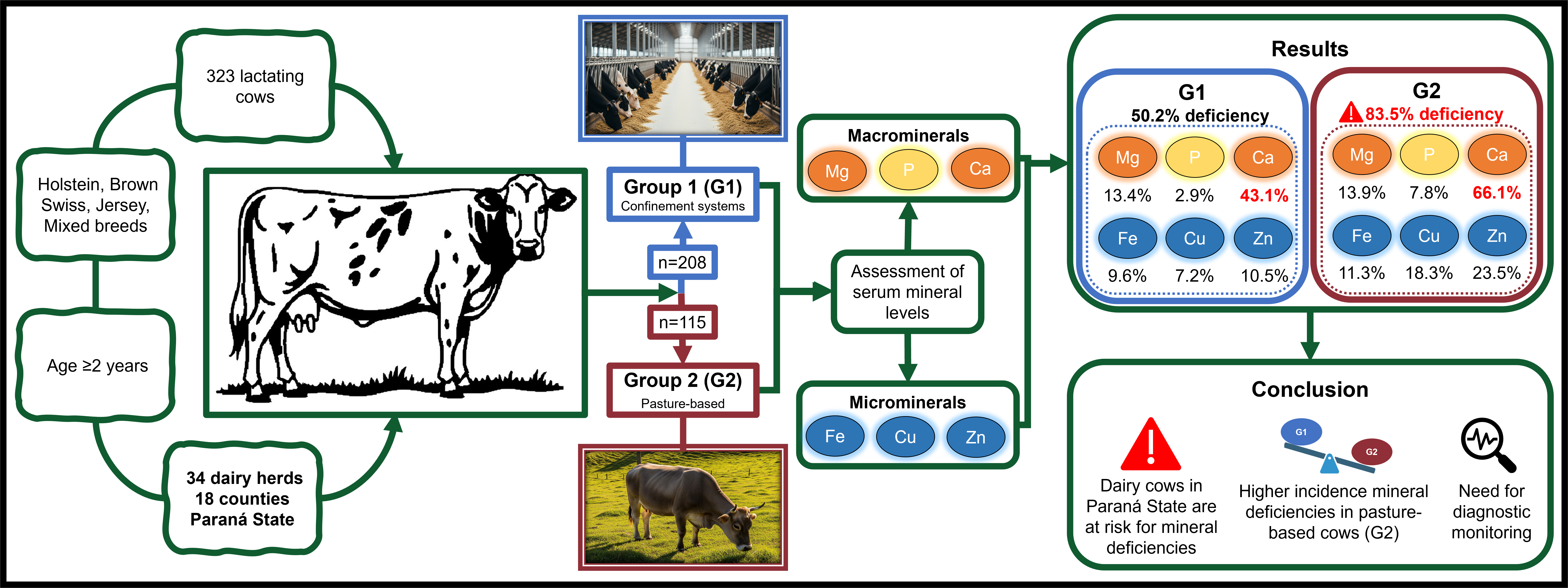 Serum macro- and microminerals (copper (Cu), iron (Fe), zinc (Zn), calcium (Ca), phosphorus (P), and magnesium (Mg)) were measured in lactating dairy cows managed under pasture-based and confinement-based systems in the state of Paraná, southern Brazil. The cross-sectional study was performed with 323 lactating cows, aged ≥2 years, from 34 dairy herds, 18 counties and 4 regions of Paraná. The cows were classified into two groups: Group 1 (G1, n=208) consisted of cows raised in confinement systems, while Group 2 (G2, n=115) included cows from pasture-based herds supplemented at feed troughs. Biochemical analyses were performed by spectrophotometry using commercial kits. The mean values found were as follows (G1 and G2): Ca = 8.1 ± 0.9 mg/dl; P = 6.1 ± 1.2 mg/dl; Mg = 2.3 ± 0.4 mg/dl; Cu = 83.6 ± 18.8 μg/dl; Zn = 94.0 ± 23.4 μg/dl; and Fe = 129.2 ± 44.2 μg/dl. The most prevalent deficiency was Ca, whereas the macromineral with the lowest prevalence of deficiency was P. Most dairy cows evaluated were not at risk of Cu intoxication. G2 had a lower mean serum mineral and a higher number of cows considered deficient than G1, with the exception of Mg. Even presuming that dairy cattle are better nourished than beef cattle the conclusion is that dairy cows in Paraná are at risk for mineral deficiencies, including Fe. This emphasizes the need for diagnostic monitoring to identify the affected cattle and herds in order to optimize animal health and production.
