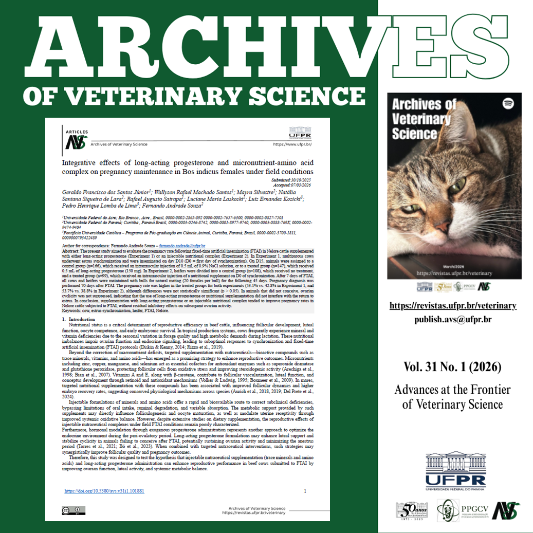 É com satisfação que apresentamos a primeira edição de 2026 da Archives of Veterinary Science. Dando continuidade ao legado de excelência consolidado nas edições de 2025, este volume de março reúne contribuições científicas que refletem a complexidade e a natureza dinâmica da medicina veterinária contemporânea.